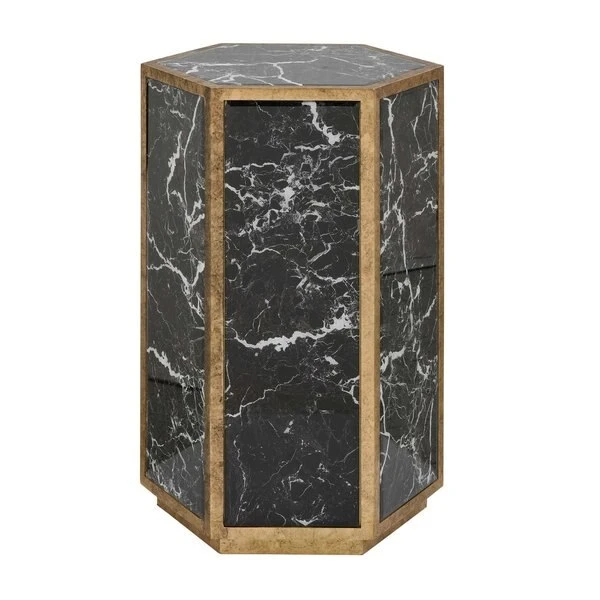 The Homer Accent Table makes a sculptural statement. With a tall solid hexagonal shape, each side is paneled with black marble and framed with gold leaf metal.