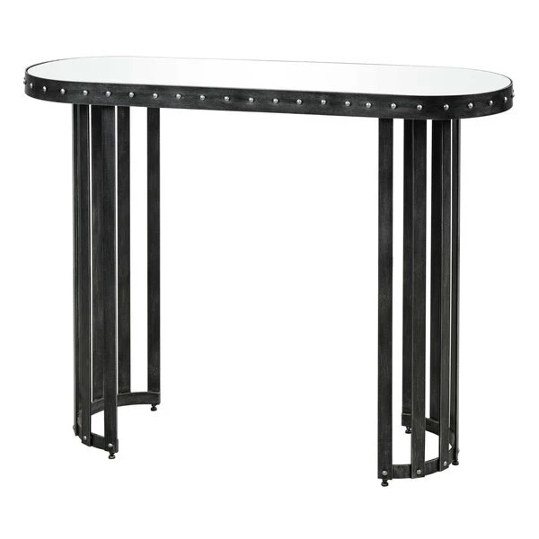 The Jennifer Console Table has a narrow, ovaline metal frame, supporting an antiqued mirror tabletop with hammered silver nailheads. The industrial look of this table makes a modern statement in an entryway or living room.