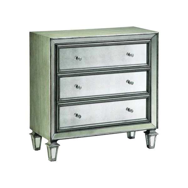 Full of elegance, yet small in footprint – this antique-mirror accent chest will fit in anywhere. It offers three storage drawers, cut-crystal hardware, mitered corners, a hand-painted silver-gray finish and a timeless silhouette.