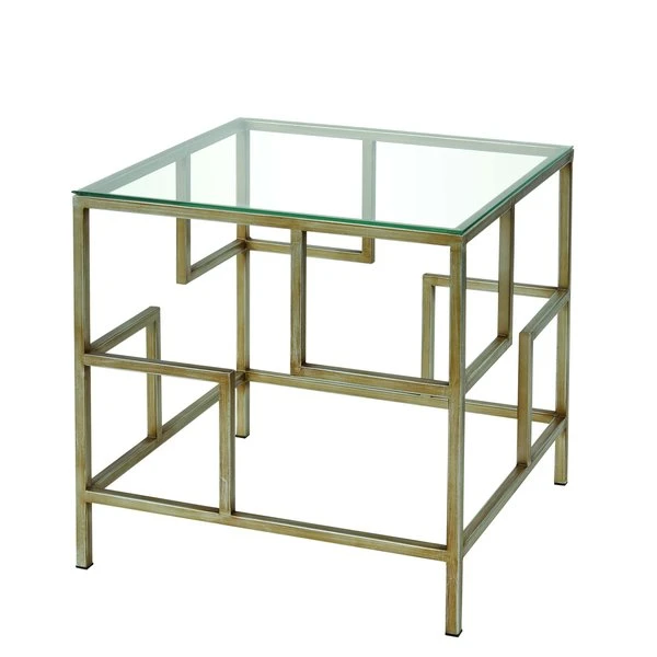 The Louisville Accent Table is a small square table with a glass top. Four sides are framed in gold metal with an angular, geometric pattern.