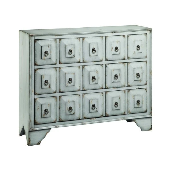 The Mohala Chest is an apothecary style chest of drawers featuring a hand-painted Aegean Mist grey finish. Each of the three drawers feature five faux square drawer fronts with drop-ring pull hardware.