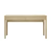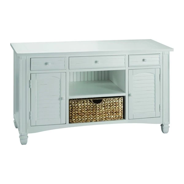 Versatile sofa or media console table with two louvered doors, three drawers, component slots, natural sea grass basket and plank style top.