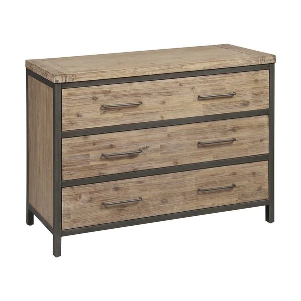 The 3-Drawer Chest is a medium wide chest framed in iron. Drawers, top and sides are made from acacia wood in a natural finish. The pairing of iron with warm natural wood adds rustic, industrial charm.