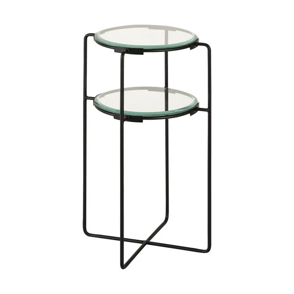 The Oscar Accent Table features a two-tier design. Made from a metal frame in a black, powered coated finish, it holds a round, clear glass table top and shelf. Ideal for a contemporary style living room or bedroom, the open frame design and clear glass mean it wont encroach on a sense of space and light while providing space for displaying a lamp, plant or other decorative items.