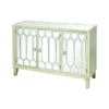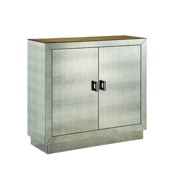 Two-door antique mirrored accent cabinet with one fixed shelf and wire management on back panel. Wood-tone finish solid wood top. Dramatic dark metal handles.