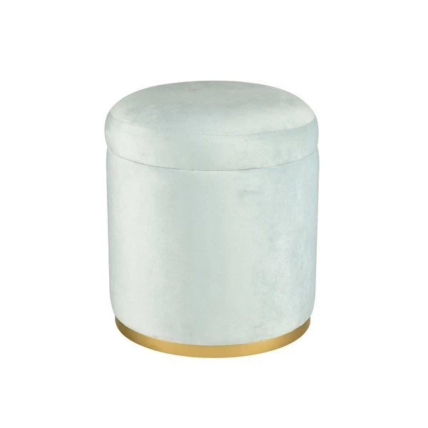 The Raina Storage Ottoman has a drum shape and a brass metal band around its base. A small ridge at the top of the velvet upholstery reveals an inner storage area. Every room benefits from a chic velvet storage piece like this Ottoman, which doubles as a side table or extra seating.