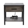 The Ramsay Accent Table features a double power socket and two USB charging ports, making it an ideal bedside table or living room accent piece. This design makes it easy to display lamps or store electronics without unsightly extension cords. Made from solid wood, the Ramsay features a drawer and shelf to add useful storage space to a bedroom or living room. Its smoke finish is hand-applied and accented with black legs and table top.