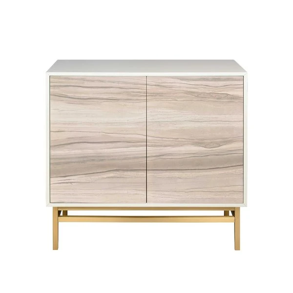 The Reynolds Cabinet is a two-door cabinet is finished in a cream color and has an abstract design painted on the two front doors. The neutral palette of cream, taupe, gray and sand are calming and the cabinet would blend easily in many lifestyles. The brass tone base elevates the look. This piece has adjustable shelves and provides valuable storage space.