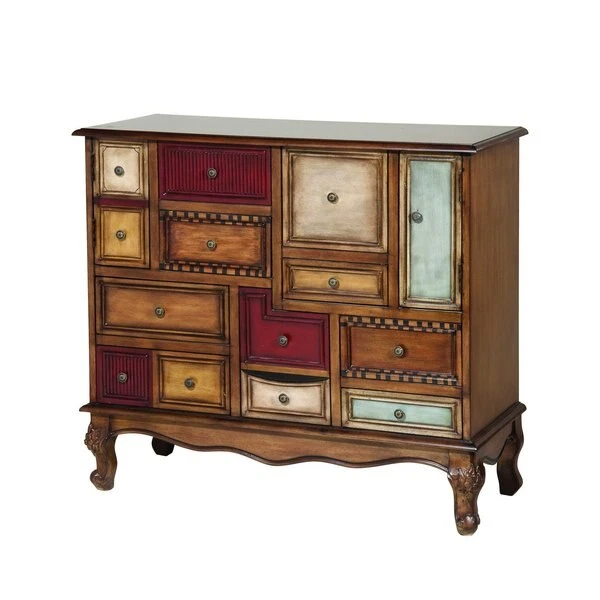 Quirky and colorful, this one-of-a-kind accent chests boasts 14 drawers. Its multi-colored finish and mixed drawer design are infinitely memorable.