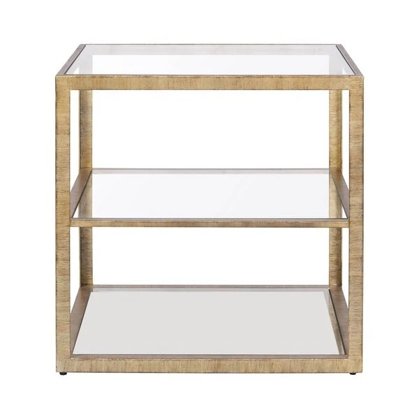 The Strie Accent Table brings instant modern glam to a living room. Its metal frame comes in a luxe gold finish and holds three glass shelves, creating a chic space that's both stylish and functional. With its open design, this piece provides a useful surface without encroaching on a sense of light and space. The Strie is a sleek, contemporary choice to add dimension to a living room or hallway.