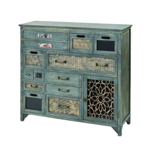 The Topanga Cabinet is perfect for today's Modern Bohemian design space. Styled with "farm-found" wood done in Weathered Grey, with Antiqued Brass pulls. Fashionable mixed-media drawer-fronts feature urban, Indo-Gothic, and Art Deco-inspired fretwork, as well as black slate and witty graphic arias. Generously scaled.
