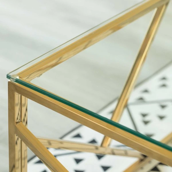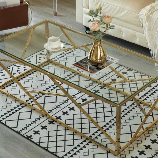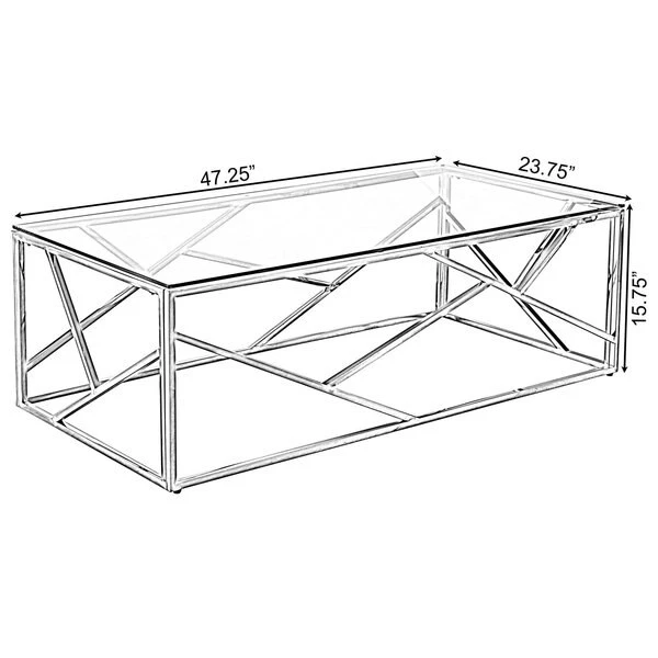 Anchor your living room look in modern fashion with this glamorous coffee table. Classic glass up top and eye-catching metal geometry on the bottom, this accent table offers style for any space. This coffee table offers durable and decorative function for everyday use. Its base features an openwork geometric design, crafted from stainless steel and featuring a polished finish. For elegant contrast, it is topped off by clear tempered glass with rubber glides to make the attachment smooth.