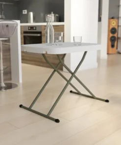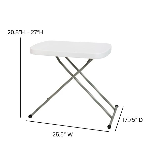 If you need extra surface space in your office cubicle, classroom, training room, dorm room, or in the home, this adjustable height personal folding table may be just what you're looking for. The granite white top gives a clean and tidy appearance to any space and adjusts from 20.8"H to 27"H to accommodate a variety of tasks. Pick one of the three height adjustment grooves and raise the tab to lock the frame in place. Lightweight for easy transport and suitable for indoor/outdoor use, this commercial grade table would be an excellent addition to any space. Use this handy piece as a laptop table while sitting on the floor to craft your term paper, a TV tray to watch your favorite show during dinner, or as a companion desk in your workspace without worry. Welded joints, metal screw construction and a gray powder coated steel frame provide a stable base to support up to 50 lbs. static weight capacity. The high density polyethylene top is ultra-strong and durable and does not break down from sun exposure so it's ideal for camping or tailgating. This multi-use side table needs no assembly and folds flat for convenient storage and transportation. A water based cleaner quickly cleans up spills and removes dust. Fixed plastic floor glides will prevent damage to your hard flooring surfaces.