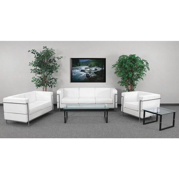 The White Leather Set with Encasing Frame brings comfort and trend-setting style to your waiting room, reception area or home.It features a straight arm design and removable seat cushions, all padded with 5'' of CA117 fire retardant foam and upholstered in leather. A stainless steel frame, accent bar enclosure and integrated legs give the chairs added strength and a distinctive flair. Make a great impression on your clients and customers with this innovative contemporary set. <ul><li>Contemporary Reception Set</li><li>Melrose White LeatherSoft Upholstery</li><li>Straight Arm Design</li><li>Taut Seat and Back</li><li>Removable Seat Cushions</li><li>Foam Filled Cushions</li><li>CA117 Fire Retardant Foam</li><li>Exposed Accent Bar</li><li>Integrated Stainless Steel Legs</li><li>LeatherSoft is leather and polyurethane for added Softness and Durability</li></ul>