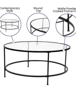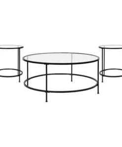 Lend any space in your home a sophisticated, polished look with this 3 piece clear glass coffee table set with matte black steel legs. This living room table set successfully marries the beauty of glass with the strength of steel that makes a definite statement. The round tops and frames contrast with the vertical legs to provide a contemporary look that's sure to tie any trendy room's presentation together. Whether you have a spacious modern home or a one bedroom apartment this round coffee table set will fit right in. The round design is perfect for an L-shaped sectional in the living room, two wingback chairs in the den or with the sofa in the family room. Not only does the ample surface area serve as a convenient space for holding belongings, it's also great for displaying magazines, newspapers, and keepsakes. Glass offers a distinctive, upscale look while providing superior strength that won't break even after heavy-duty use. Move these on-trend tables anywhere you wish without having to worry about scratches on your floors. Fixed floor glides prevent damage to your flooring and enable easy movement. Quickly remove dust or spills with a water based cleaner to keep these striking pieces looking brand new.