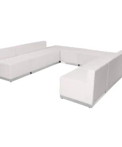 Your lobby or reception area is the forefront of your business and providing distinguished and comfortable seating is the first step towards making a great impression. This collection offers modular pieces that will allow you to reconfigure the space to accommodate your guests as your business grows. Purchase this complete set and add on any additional pieces now or later. <ul><li>Contemporary Reception Set</li><li>Modernize Your Business Office or Entry Way</li><li>Add on pieces as your business grows</li><li>Modular components make reconfiguring easy with endless possibilities</li><li>Features:</li><li>Melrose White LeatherSoft Upholstery</li><li>Exposed Embellished Stitching</li><li>Taut Seat and Back</li><li>Foam Filled Cushions</li><li>CA117 Fire Retardant Foam</li></ul>