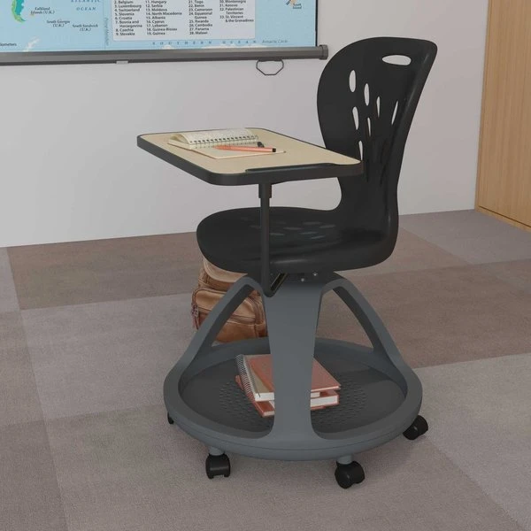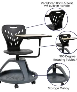 In today's world, students are more likely to work from laptops and tablets than with pencil and paper, mobile workstations can have a substantial impact on how they learn. A mobile desk chair is perfect for the 21st-century style of remote learning and collaborative classroom environments. The tablet arm provides ample work surface for a tablet or laptop and rotates 360 degrees for multi-position use. The seat swivels independently of the bottom to reach multiple surfaces without strain. Keep their work surface free of clutter and ensure each student has what they need by storing personal belongings in the built-in cubby under the seat that will hold up to 22 pounds. Recommended for 7th-grade students and up, this versatile chair has an ultra strong iron frame and will support up to 265 lbs. weight capacity. The ventilated back and seat will provide airflow to promote a better learning environment. Six heavy-duty casters and the built-in handle on the back allow this tablet armchair to smoothly move from individual to group projects, homeschool areas, and living room to dining room or kitchen with minimal effort. Chair assembles within 30 minutes with the included tools for quick setup and use. Spills clean up with a water based cleaner to keep busy classrooms moving smoothly. This multi-use mobile desk chair is ideal for classroom or distance learning and students will love having their own space that can go where they go.