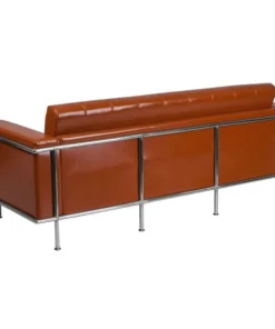 Your office reception space speaks to who your are as a company and this cognac LeatherSoft upholstered sofa with encasing frame makes quite a statement. This trendsetting piece features a straight arm design, and foam filled, tufted, fixed back and seat cushions for exceptional comfort. LeatherSoft is leather and polyurethane for added softness and durability. The integrated stainless steel frame and exposed accent bar not only add style, they are rust resistant and will keep up with the rigors of commercial use. Make a great impression on your clients, customers, and guests with this innovative contemporary sofa. This progressive style seating brings comfort and trend-setting style to your waiting room, reception area or home.