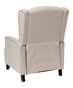 Old school tradition meets modern sophistication in this newly designed slim silhouette push back recliner. Featuring cream polyester fabric upholstery, straight arms, and accent nailhead trim, this living room recliner is just right for refreshing your space or furnishing a new home. High legs in a wood grain finish complete the look of this wingback chair and make floor cleaning easier. Beauty may be only skin deep but this reclining chair is more than a pretty face. A solid plywood core and steel frame with metal screw reinforcements ensure a worry-free seating experience while the generously padded pocket spring seat provides comfort. Simply place your hands on the arms and push backwards letting your weight recline the back and raise the footrest. Assembly of your new recliner requires no tools and takes less than 10 minutes with the included illustrated assembly instructions. Spot clean with water and a neutral detergent to maintain the chairs appearance. Fixed plastic floor glides will prevent damage to your hard flooring surfaces if you bump the chair or choose to move it.