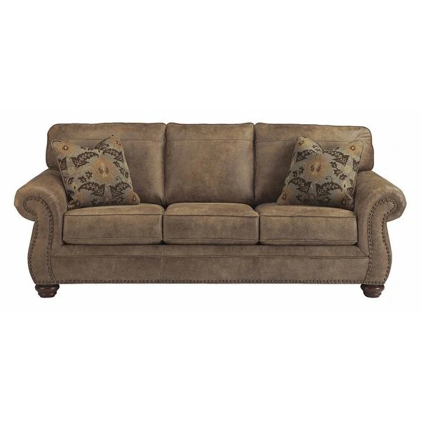 Dramatically transform your living space with the rustic look of weathered leather you love at a fraction of the cost. That's the beauty of this earth faux leather sofa. Washed in earthy Southwestern tones, with generous back and seating support and jumbo window-pane stitching, it envelops you in comfort and quality. Classic elements such as rolled arms and turned feet bring in just enough traditional touch while the included decorative toss pillows add a fashionable touch that can be enhanced with a throw for that "lived in" look. Spills and other messes can be taken care of with a water-based cleaner so relax and enjoy your beautiful furniture.
