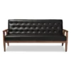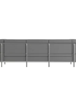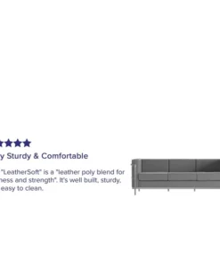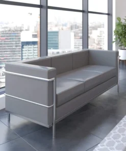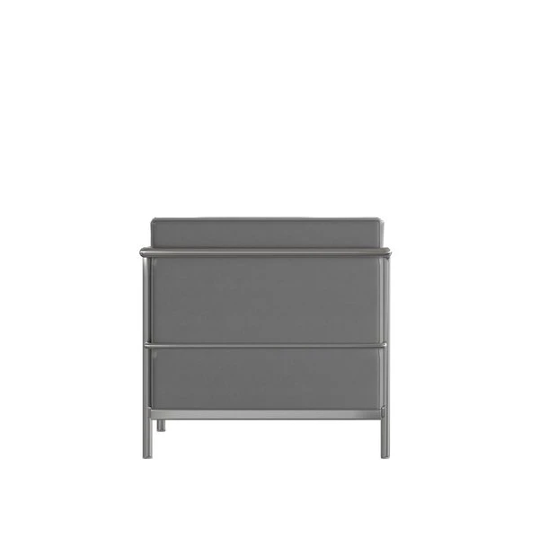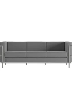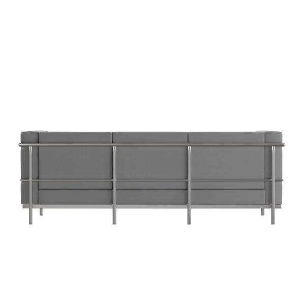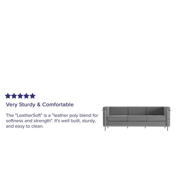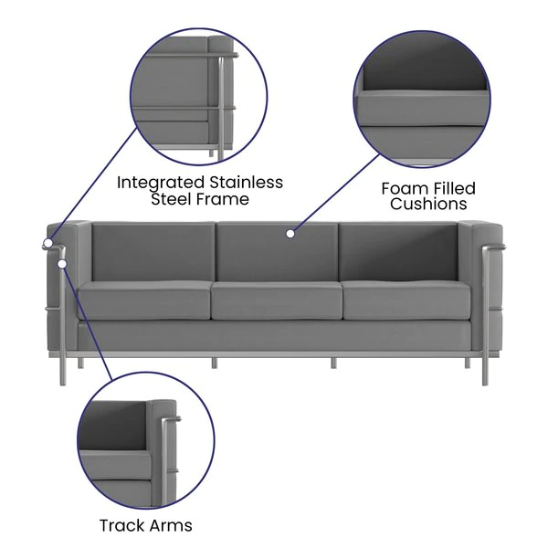 Your office reception space speaks to who you are as a company and this gray LeatherSoft upholstered sofa with encasing frame makes quite a statement. This trendsetting piece features a straight arm design and 3 removable square seat cushions, all padded with 5" of foam for exceptional comfort. LeatherSoft is leather and polyurethane for added softness and durability. A stainless steel frame, accent bar enclosure and integrated legs give this chair added strength and a distinctive flair. Make a great impression on your clients, customers, and guests with this innovative contemporary chair. This progressive style chair brings comfort and trend-setting style to your waiting room, reception area or home.