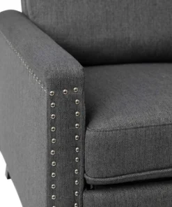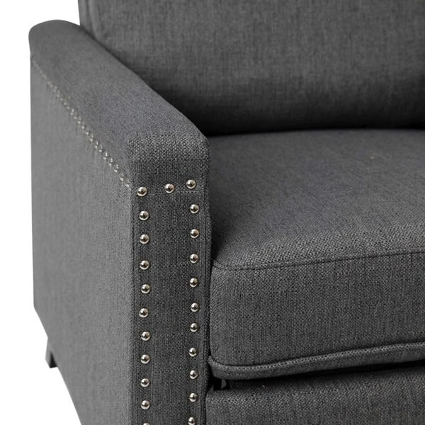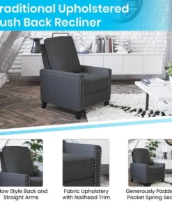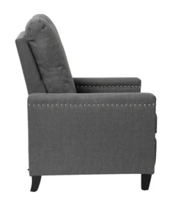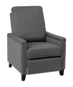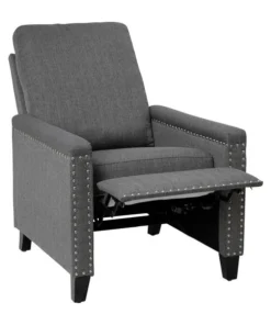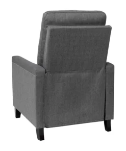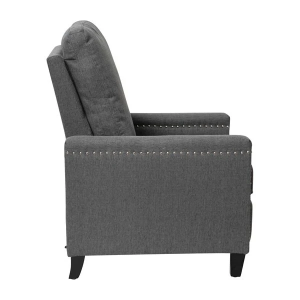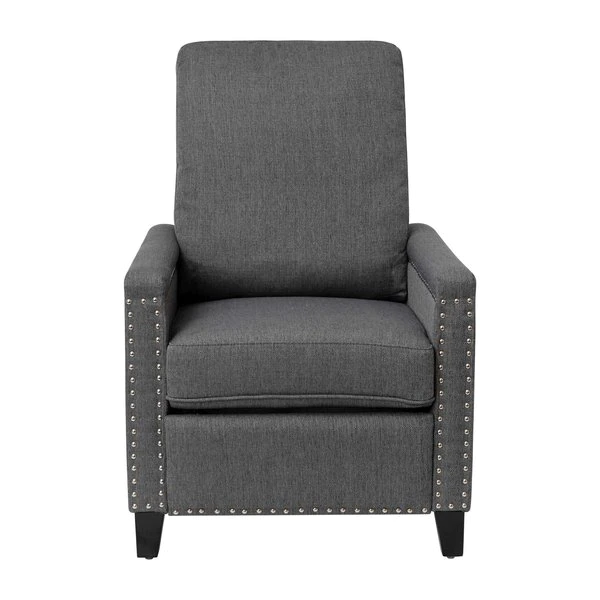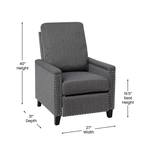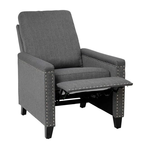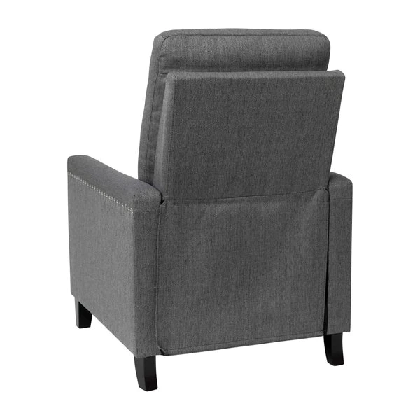 Modern sensibilities abound in the fresh design of this push back reclining chair. Neutral gray polyester fabric upholstery, pillow style back, straight arms, and accent nailhead trim give an updated look to a classic style. High flared legs in a wood grain finish complete the look of this recliner chair and make floor cleaning easier. Furnishing a new home or upgrading the look of your current space shouldn't be a stressor. A solid plywood core and steel frame with metal screw reinforcements ensure a worry-free seating experience while the amply padded pocket spring seat provides comfort. Simply place your hands on the arms and push backwards allowing your weight to recline the back and raise the footrest. Assembly requires no tools and takes less than 10 minutes with the included illustrated assembly instructions. Spot clean with water and a neutral detergent to maintain the chairs appearance. Fixed plastic floor glides will prevent damage to your hard flooring surfaces when moving the chair.