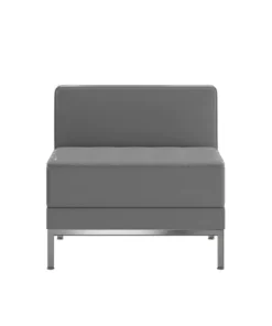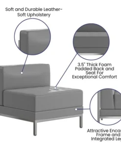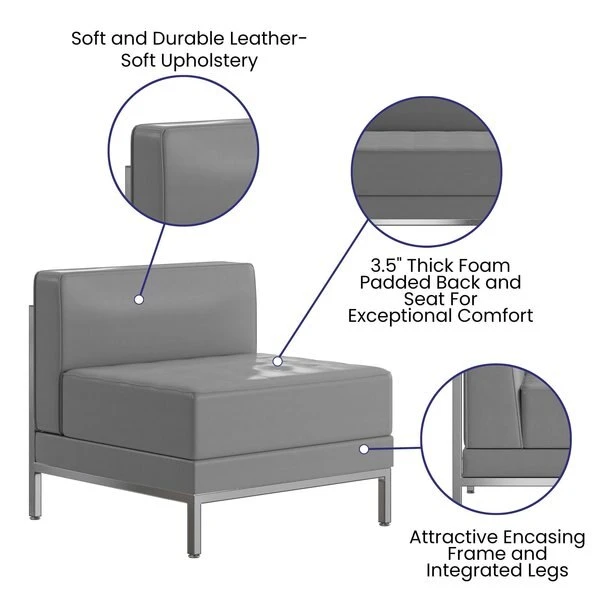 Moving your furniture around is a quick and easy way to change up the look and feel of your space so modular pieces like this gray LeatherSoft upholstered middle chair are a must have. LeatherSoft is leather and polyurethane for added softness and durability. This modern armless chair gives an upscale, sophisticated look to any space and can be used in conjunction with other pieces or as a standalone. Exposed stainless steel and LeatherSoft upholstery master the art of mixed media giving you a distinctive look your guests and clients are sure to appreciate. As your business grows, you can add on more pieces and reconfigure your design. This innovative contemporary chair will bring comfort and trend-setting style to your waiting room, reception area or lounge.