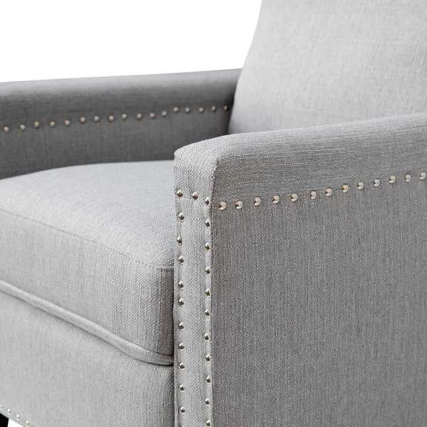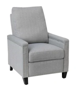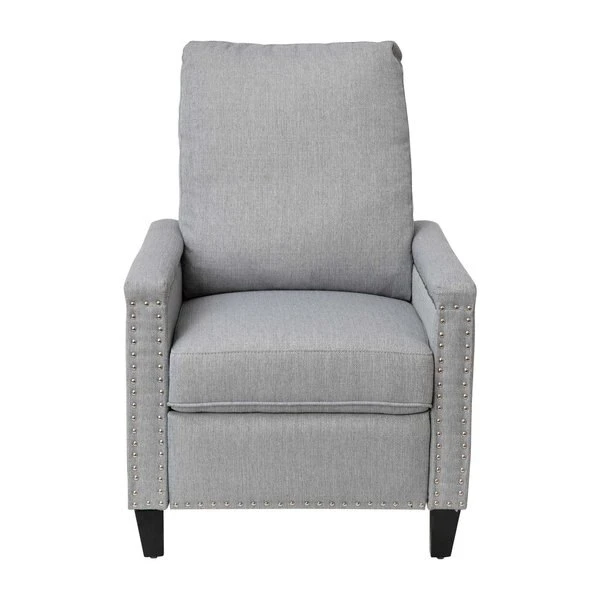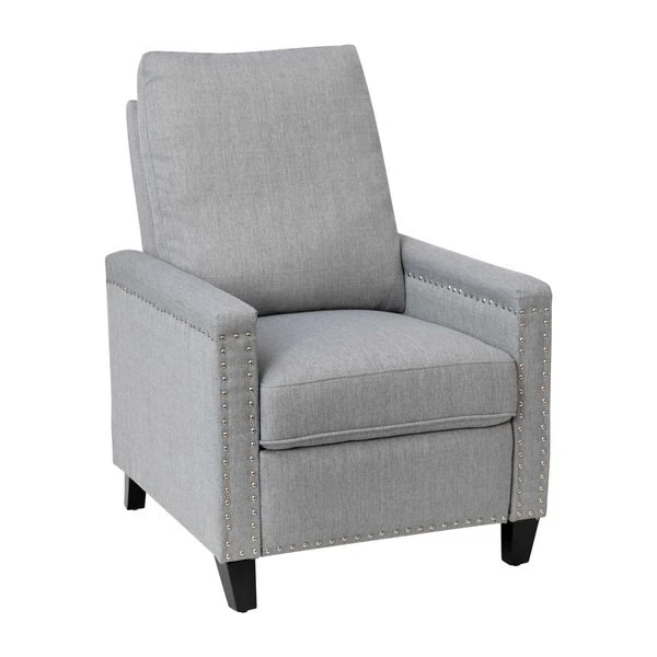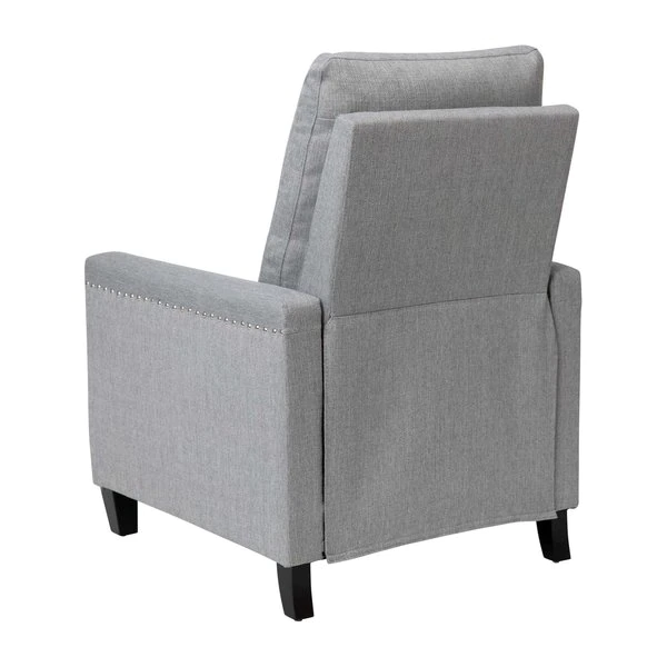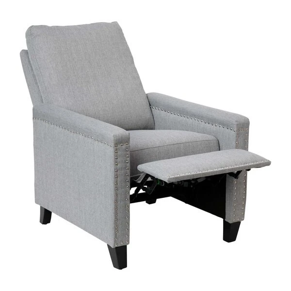 Modern sensibilities abound in the fresh design of this push back reclining chair. Neutral light gray polyester fabric upholstery, pillow style back, straight arms, and accent nailhead trim give an updated look to a classic style. High flared legs in a wood grain finish complete the look of this recliner chair and make floor cleaning easier. Furnishing a new home or upgrading the look of your current space shouldn't be a stressor. A solid plywood core and steel frame with metal screw reinforcements ensure a worry-free seating experience while the amply padded pocket spring seat provides comfort. Simply place your hands on the arms and push backwards allowing your weight to recline the back and raise the footrest. Assembly requires no tools and takes less than 10 minutes with the included illustrated assembly instructions. Spot clean with water and a neutral detergent to maintain the chairs appearance. Fixed plastic floor glides will prevent damage to your hard flooring surfaces when moving the chair.
