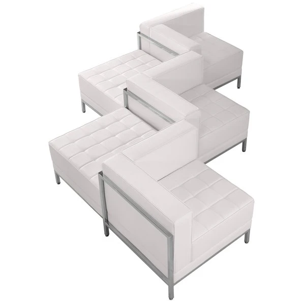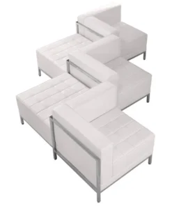 Your lobby or reception area is the forefront of your business and providing distinguished and comfortable seating is the first step towards making a great impression. This collection offers modular pieces that will allow you to reconfigure the space to accommodate your guests as your business grows. Purchase this complete set and add on any additional pieces now or later. <ul><li>Contemporary Reception Set</li><li>Add on pieces as your business grows</li><li>Modular components make reconfiguring easy with endless possibilities</li><li>Features:</li><li>Melrose White LeatherSoft Upholstery</li><li>Straight Arm Design</li><li>Smooth Back and Tufted Seat</li><li>Fixed Seat and Back Cushions</li><li>Foam Filled Cushions</li><li>CA117 Fire Retardant Foam</li></ul>