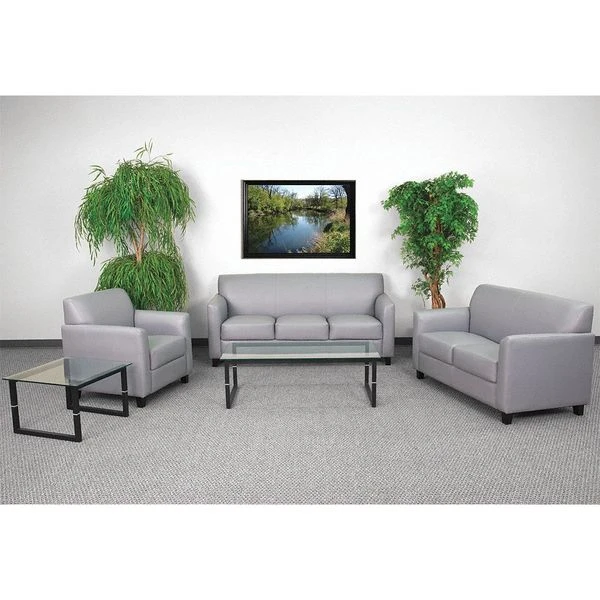 This collection will transform your reception area. This set will make an ideal choice in the office and as waiting room seating. The contemporary design of this furniture adapts in several different settings. This set features comfortable cushions, flared arms and raised feet. Not only will this set fit in a professional environment, but will add a modern look to your home. <ul><li>Contemporary Reception Set</li><li>Gray LeatherSoft Upholstery</li><li>Flared Arms</li><li>Plush Seat and Back</li><li>Fixed Seat and Back Cushions</li><li>Foam Filled Cushions</li><li>CA117 Fire Retardant Foam</li><li>Hardwood Construction</li><li>Black Wood Feet</li><li>LeatherSoft is leather and polyurethane for added Softness and Durability</li></ul>