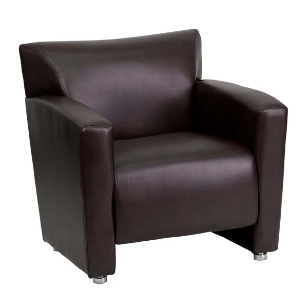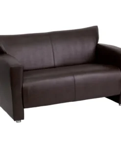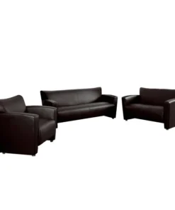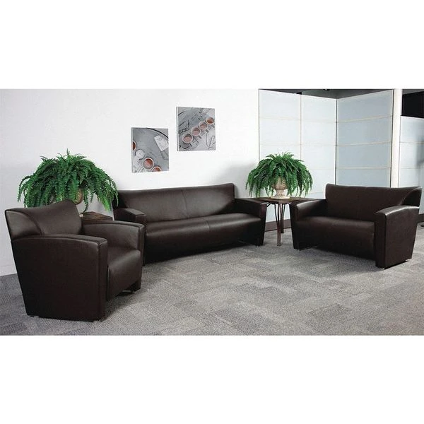 This attractive leather reception set will transform your reception area. This set will make an ideal choice in the office and as waiting room seating. The contemporary design of this collection adapts in several different settings. This set features attractive arms and raised aluminum feet. Not only will this set fit in a professional environment, but will add a modern look to your home. <ul><li>Contemporary Reception Set</li><li>Brown LeatherSoft Upholstery</li><li>Flared Arms</li><li>Sculpted Seat and Back</li><li>Fixed Seat Cushion</li><li>1.8 High Density Foam</li><li>CA117 Fire Retardant Foam</li><li>Hardwood Construction</li><li>Brushed Aluminum Feet</li><li>LeatherSoft is leather and polyurethane for added Softness and Durability</li></ul>