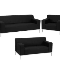 This contemporary reception set features a back that slightly protrudes pasts the arms and stainless steel legs that elevate it off the ground. This set will adapt in a variety of environments with its clean line appearance, thick fixed cushion seats and overall comfort level. <ul><li>Contemporary Reception Set</li><li>Black LeatherSoft Upholstery</li><li>Straight Arm Design</li><li>Fixed Seat Cushion</li><li>Attractive Line Stitching throughout</li><li>Foam Filled Cushions</li><li>CA117 Fire Retardant Foam</li><li>Integrated Stainless Steel Legs</li><li>LeatherSoft is leather and polyurethane for added Softness and Durability</li><li>Chair: 36''W x 31''D x 29.25''H</li></ul>
