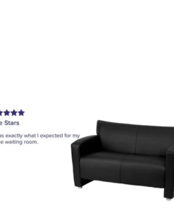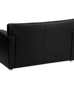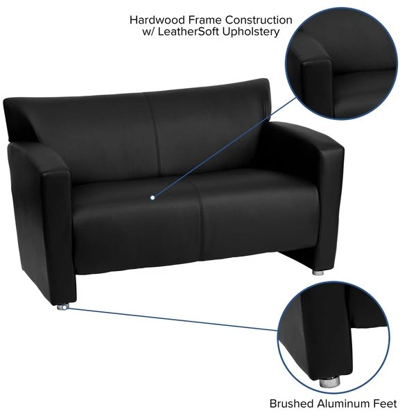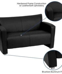 Having proper reception furniture is essential for companies wanting to make both clients and employees feel comfortable. Selecting inviting reception pieces will welcome visitors for the first time and make them want to visit again. The contemporary design will adapt in several different settings. This loveseat offers an attractive design with raised feet and an open base design. Not only will this chair fit in a professional environment, but will add a modern look to your home. <ul><li>Contemporary Style</li><li>Black LeatherSoft Upholstery</li><li>Flared Arms</li><li>Sculpted Seat and Back</li><li>Fixed Seat Cushion</li><li>1.8 High Density Foam</li><li>CA117 Fire Retardant Foam</li><li>Hardwood Construction</li><li>Brushed Aluminum Feet</li><li>LeatherSoft is leather and polyurethane for added Softness and Durability</li></ul>