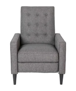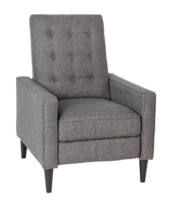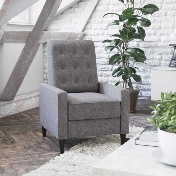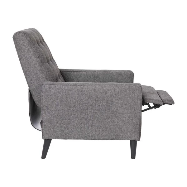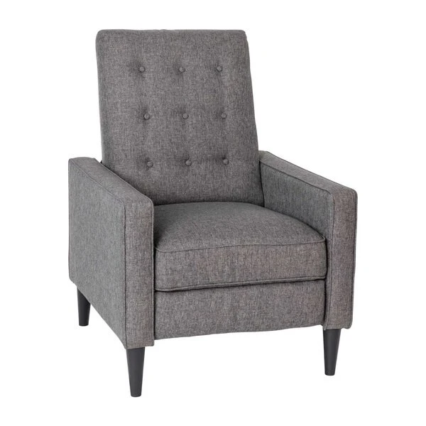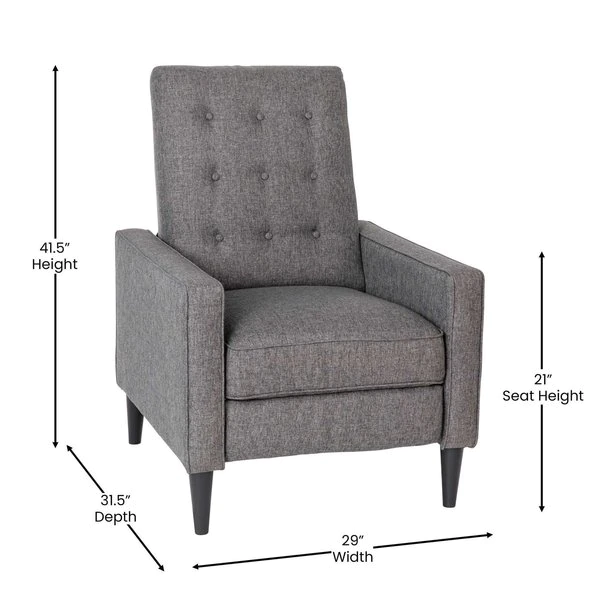 Settle down with your favorite book at home or provide a relaxing seat for guests at your B&B or the waiting room at your office with this modern pushback recliner. Upholstered in durable fabric and boasting a button tufted back, this recliner chair is stylish enough for any space. Complementary black rubberwood legs round out the look of this modern recliner. Whether you use this chair in a home or business setting, you won't have to worry about durability. Generous foam padding over no-sag sinuous springs provides a long-lasting chair in any environment. Place your hands on the arms, push backward and allow your body weight to extend the footrest. This commercial grade recliner holds up to 300 lbs. static weight capcity making it suitable for both home and business use. 10 Minutes or less is all it takes to get this reclining chair assembled and ready for use making set up quick and easy. Spot clean with a damp cloth to remove spills. Plastic floor glides will protect your hard flooring surfaces if the chair is moved.