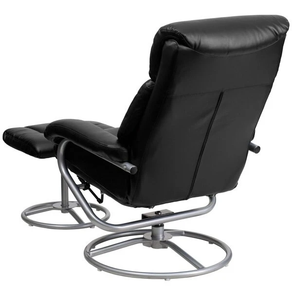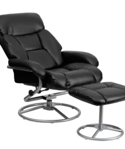 This overstuffed recliner will look great in any room in the home or office. Sporting a pillow top headrest and plush arms the recliner and ottoman provides ultimate relaxation. Thanks to its soft and durable black LeatherSoft upholstery, this recliner and ottoman set has a luxurious feel while remaining easy to maintain. This set features plush padding throughout the chair and ottoman as well as exposed metal bases. For added comfort, this recliner is built with a swivel seat and a tension knob so you can lock the seat in either the recline or upright position. Designed with durability in mind, this recliner has a metal base and plastic floor glides to protect your floor from scratches.