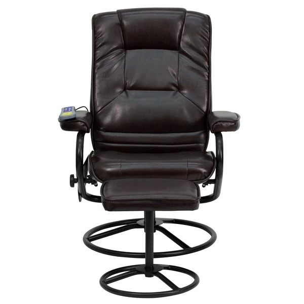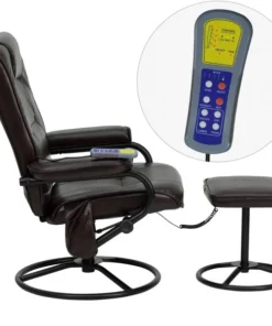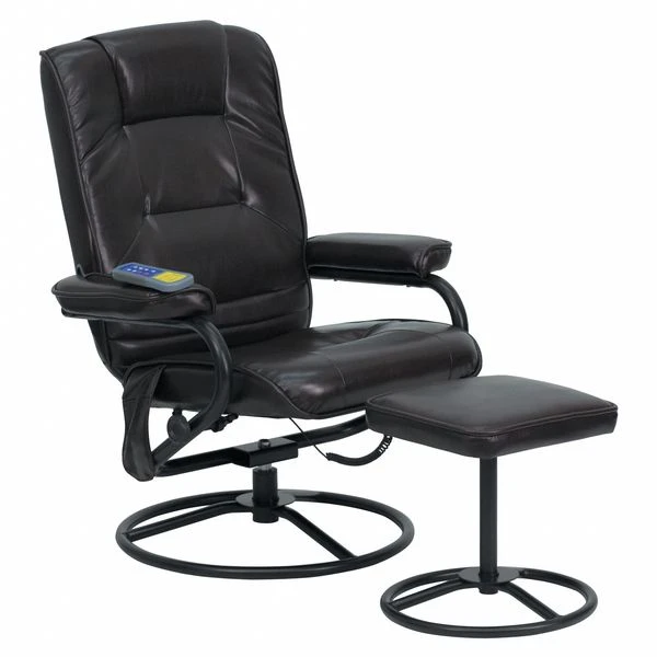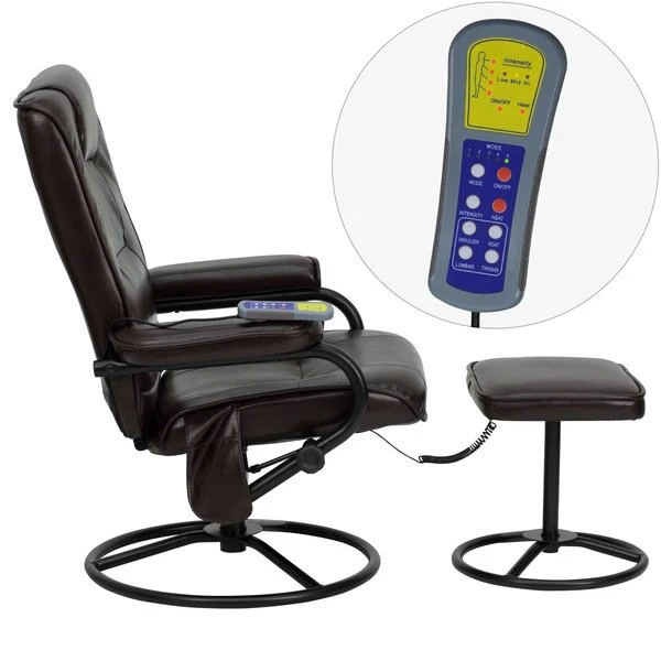 Work on relieving your stress and cramped muscles while you work on that big presentation. Enjoy a relaxing massage in the comfort of your own home or office with this black recliner and ottoman set. This recliner features soft and durable LeatherSoft upholstery which is exceptionally rich and adds a contemporary appeal to any decor. This set offers maximum massaging power that massages your back, lumbar area and thighs. With three intensity levels and five massage modes you are sure to get the comfort that you're looking for. Look no further for your perfect massage chair offered at an incredible price!