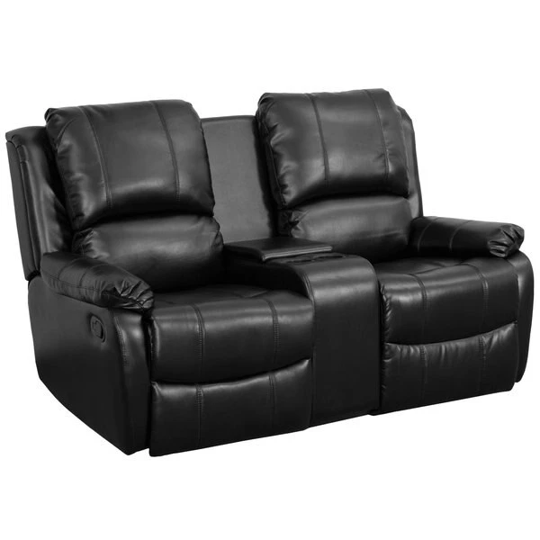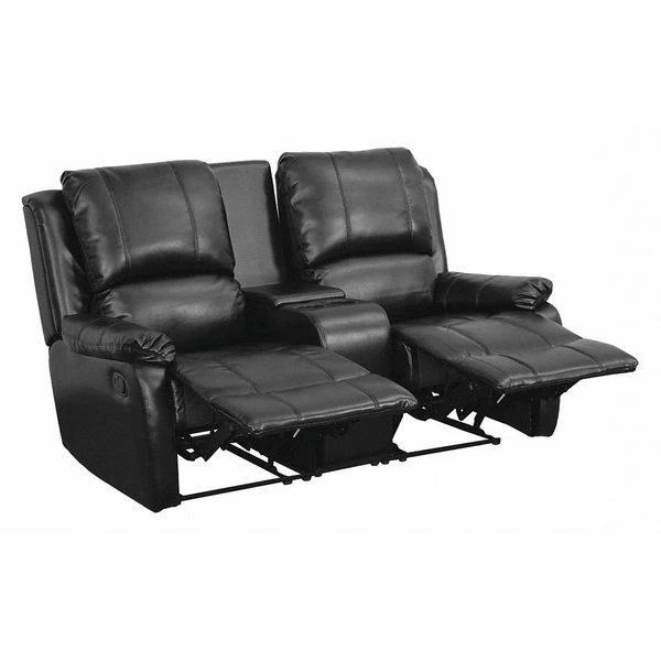 Spend some quality time with your family and friends for memorable movie nights, epic game days and legendary video game marathons, relaxing on this black home theater seating unit boasting soft and durable LeatherSoft upholstery. The ultimate in contemporary home theater seating, it features 2 recliners with recessed levers with generous amounts of foam padding in the back and seat. The seat back has an integrated headrest for extra comfort. This recliner unit has cup holders for your favorite beverages, and a storage console for remote controls, magazines and game controllers. Plastic floor glides protect your floor by sliding smoothly when you need to move it. When you have home theater seating, you can make every game day an event that rivals the Big Game; treat your friends to a cinematic experience; and challenge your friends and family to a virtual duel! You can setup as many rows as needed to fill up your desired space.