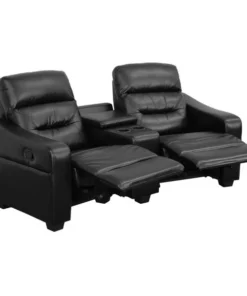Spend some quality time with your family and friends for memorable movie nights, epic game days and legendary video game marathons, relaxing on this black home theater seating unit boasting soft and durable LeatherSoft upholstery. The ultimate in contemporary home theater seating, it features 2 recliners with recessed levers while the plush back has generous amounts of foam padding. This recliner unit has cup holders for your favorite beverages, and a storage console for remote controls, magazines and game controllers. Plastic floor glides protect your floor by sliding smoothly when you need to move it. When you have home theater seating, you can make every game day an event that rivals the Big Game; treat your friends to a cinematic experience; and challenge your friends and family to a virtual duel! You can setup as many rows as needed to fill up your desired space.