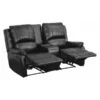 Take your entertainment experience to the next level with theater seats designed for maximum comfort and durability. Kick back and relax while watching your favorite movies or playing video games in this black reclining theater seating constructed with soft and durable LeatherSoft upholstery for comfort. Reclining sofas add an appealing look to any space while ensuring a true, movie-like feel. Stretch out in these home theatre seats featuring two recliners with recessed levers and a middle recliner with a pull handle. Naturally slanted armrests lend a cozy element while each of the three consoles features plush, pillowy cushions filled with generous amounts of fire-retardant foam padding. Keep remotes, game controllers, and magazines out of sight with our reclining sofas that include fold-up armrests and deep storage compartments. The storage consoles in this LeatherSoft sectional sofa also include two cup holders for easy access to your favorite beverages. Easily clean accidental spills and stains with a water based cleaner to keep your home theater seats looking like new. Bring the magic of the cinema to your home with a LeatherSoft reclining sofa that creates an authentic movie theatre experience in the comfort of your own home. Sink into the luxury of these theater seats that are built to last and offer the necessary perks to upgrade any movie night. Set up as many rows of theatre seating as needed in a man cave, game room, home theatre, or living room to entertain family and friends for hours on end.