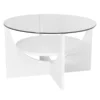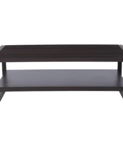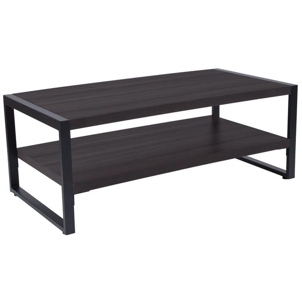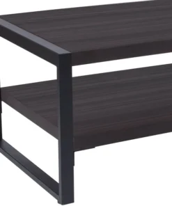 Furnish your living room with this beautiful coffee table. Raised shelf for decorative items and photos. This center piece will meet all of your needs for displaying and holding your common living room items. Adjustable floor glides keep the table level on uneven floors. <ul><li>Contemporary Style</li><li>Charcoal Wood Grain Laminate Finish</li><li>1.5'' Thick Rectangle Top</li><li>Height Between Shelves: 8.25''H</li><li>Black Powder Coated Frame Finish</li><li>Adjustable Floor Glides</li></ul>