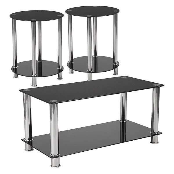 Do something a little different with the fresh look of this 3 piece coffee table set. Black glass forms the top and lower shelf of each piece in this coffee table set. Cylindrical stainless steel legs are polished to a high shine. For a change of pace, the coffee table is rectangular, and the end tables are round. This sleek looking table set offers a design that will look great in any room. Bottom shelves give extra real estate for displaying decorative items or photos. This distinct set will meet all of your needs for displaying and holding your common living room items.