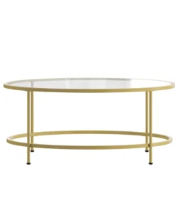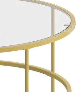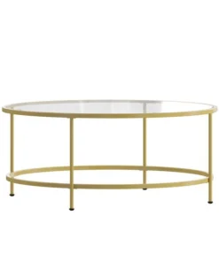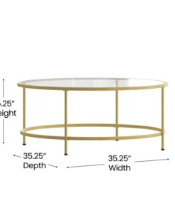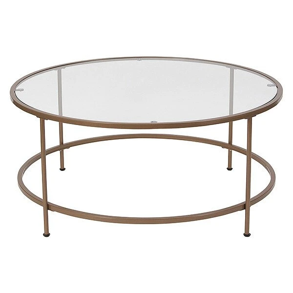 Lend any space in your home a sophisticated, polished look with this round clear glass coffee table with brushed gold steel legs. This living room coffee table successfully marries the beauty of glass with the strength of steel that makes a definite statement. The round top and frame contrast with the vertical legs to provide a contemporary look that's sure to tie any trendy room's presentation together. Whether you have a spacious modern home or a one bedroom apartment this round coffee table will fit right in. The round design is perfect for an L-shaped sectional in the living room, two wingback chairs in the den or with the sofa in the family room. Not only does its ample surface area serve as a convenient space for holding belongings, it's also great for displaying magazines, newspapers, and keepsakes. Glass offers a distinct, upscale look while providing superior strength that won't break even after heavy-duty use. Move this on-trend coffee table anywhere you wish without having to worry about scratches on your floors. Fixed floor glides prevent damage to your flooring and enable easy movement. Quickly remove dust or spills with a water based cleaner to keep this striking piece looking brand new. Add a pair of our glass end tables with brushed gold frame to pull your design together.