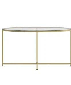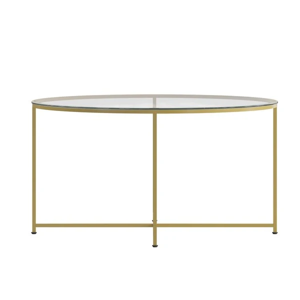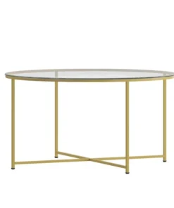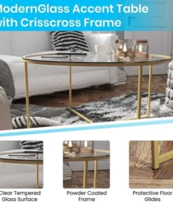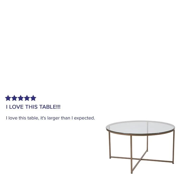 Add an upscale look to any room in your living space with the effortless style of this coffee table. Featuring a crystal clear glass top, this occasional table set lends an open, airy feel to any space. The round shape atop modern crisscross brushed gold metal legs completes the overall look of this stunning piece. Whether you're serving coffee, tea, or just want a place for decorative items, you will never have to worry about the safety of this table. Strong, 6mm tempered glass resists breakage even with daily use while the sturdy cross brace metal frame keeps your possessions secure. A durable powder coated finish ensures this living room table will look great for years to come. Have your new table ready to use in under 30 minutes with the included step-by-step instructions and included tools. Floor glides will protect your hard flooring surfaces from scuffs and scrape and messes clean up quickly and easily with a water based cleaner.