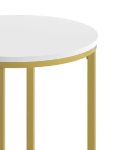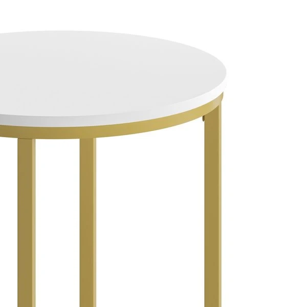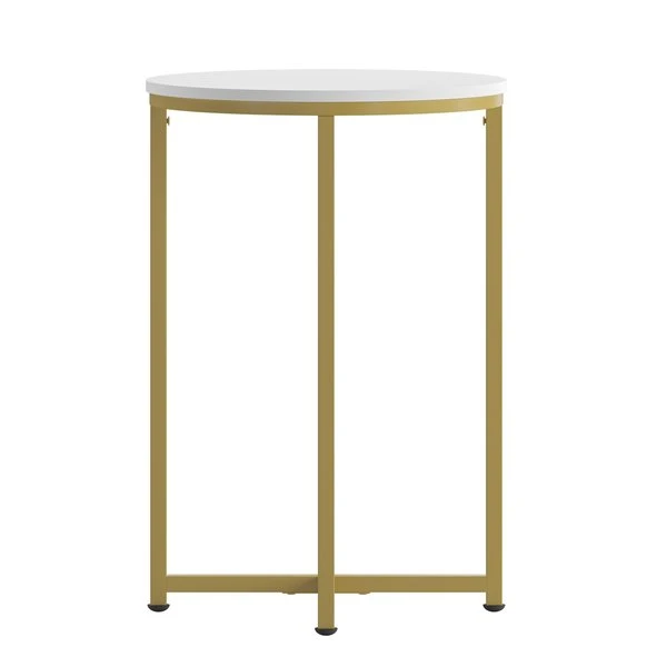 Update the atmosphere in your home with the sophisticated, polished look of this mixed media end table. Featuring a white finished laminate top, this occasional table blends seamlessly in any space. The round shape atop modern crisscross brushed gold metal legs completes the overall look of this stunning piece. Whether you're serving coffee, tea, or just want a place for decorative items, you will never have to worry about the safety of this table. The strong .5 inch thick engineered wood top stands up to daily use while the sturdy cross brace metal frame holds up to 55 lbs. static weight capacity. A durable powder coated finish ensures this living room table will look great for years to come. Have your new end table ready to use in under 30 minutes with the included step-by-step instructions and included tools. Floor glides will protect your hard flooring surfaces from scuffs and scrape and messes clean up quickly and easily with a water based cleaner.