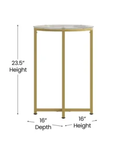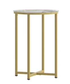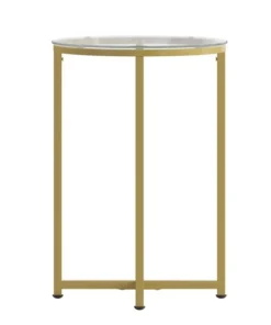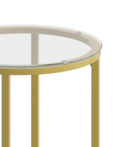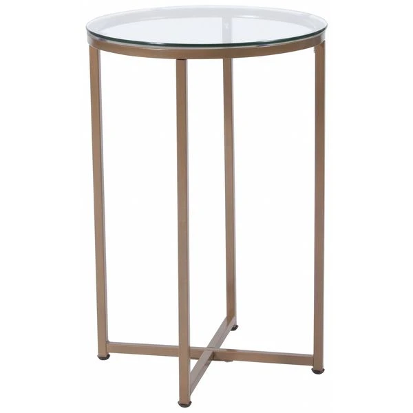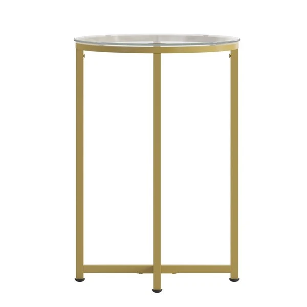 Add an upscale look to any room in your living space with the effortless style of this end table. Featuring a crystal clear glass top, this occasional table set lends an open, airy feel to any space. The round shape atop modern crisscross brushed gold metal legs completes the overall look of this stunning piece. Whether you're serving end, tea, or just want a place for decorative items, you will never have to worry about the safety of this table. Strong, 6mm tempered glass resists breakage even with daily use while the sturdy cross brace metal frame keeps your possessions secure. A durable powder coated finish ensures this living room table will look great for years to come. Have your new table ready to use in under 30 minutes with the included step-by-step instructions and included tools. Floor glides will protect your hard flooring surfaces from scuffs and scrape and messes clean up quickly and easily with a water based cleaner.