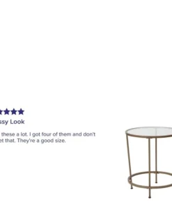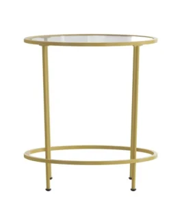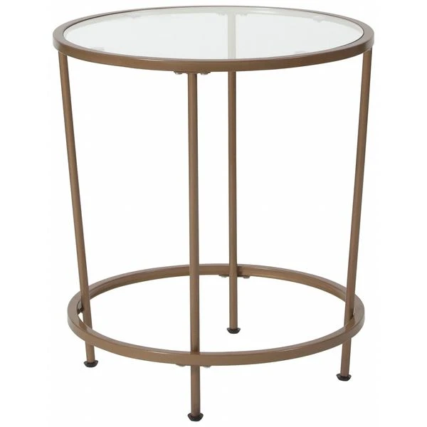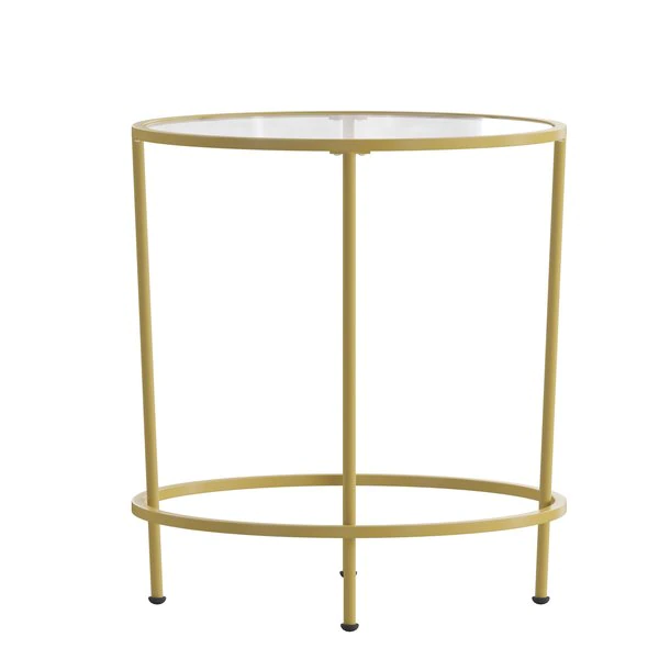 Lend any space in your home a sophisticated, polished look with this round clear glass end table with brushed gold steel legs. This living room end table successfully marries the beauty of glass with the strength of steel that makes a definite statement. The round top and frame contrast with the vertical legs to provide a contemporary look that's sure to tie any trendy room's presentation together. Whether you have a spacious modern home or a one bedroom apartment this round end table will fit right in. The round design is perfect for an L-shaped sectional in the living room, two wingback chairs in the den or with the sofa in the family room. Not only does its ample surface area serve as a convenient space for holding belongings, it's also great for displaying magazines, newspapers, and keepsakes. Glass offers a distinct, upscale look while providing superior strength that won't break even after heavy-duty use. Move this on-trend end table anywhere you wish without having to worry about scratches on your floors. Fixed floor glides prevent damage to your flooring and enable easy movement. Quickly remove dust or spills with a water based cleaner to keep this striking piece looking brand new. Add a pair of our glass end tables with brushed gold frame to pull your design together.
