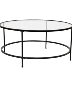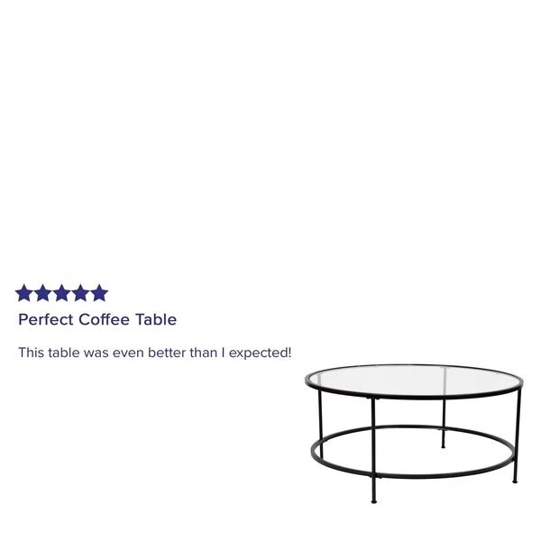 Lend any space in your home a sophisticated, polished look with this round clear glass coffee table with matte black steel legs. This living room coffee table successfully marries the beauty of glass with the strength of steel that makes a definite statement. The round top and frame contrast with the vertical legs to provide a contemporary look that's sure to tie any trendy room's presentation together. Whether you have a spacious modern home or a one bedroom apartment this round coffee table will fit right in. The round design is perfect for an L-shaped sectional in the living room, two wingback chairs in the den or with the sofa in the family room. Not only does its ample surface area serve as a convenient space for holding belongings, it's also great for displaying magazines, newspapers, and keepsakes. Glass offers a distinct, upscale look while providing superior strength that won't break even after heavy-duty use. Move this on-trend coffee table anywhere you wish without having to worry about scratches on your floors. Fixed floor glides prevent damage to your flooring and enable easy movement. Quickly remove dust or spills with a water based cleaner to keep this striking piece looking brand new. Add a pair of our glass end tables with matte black frame to pull your design together.