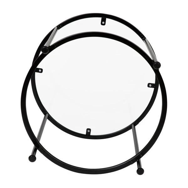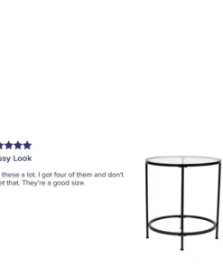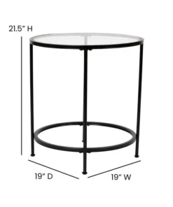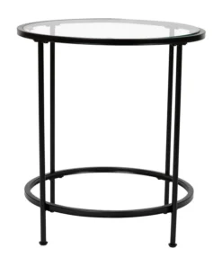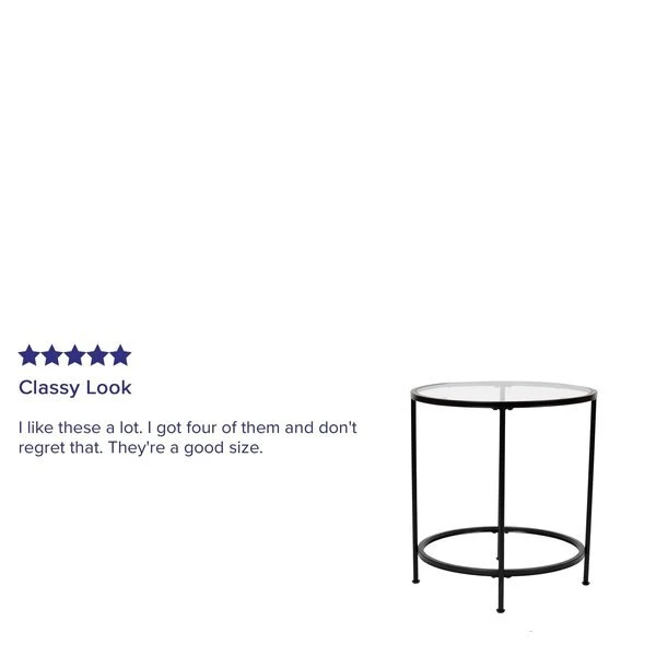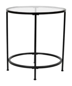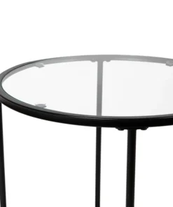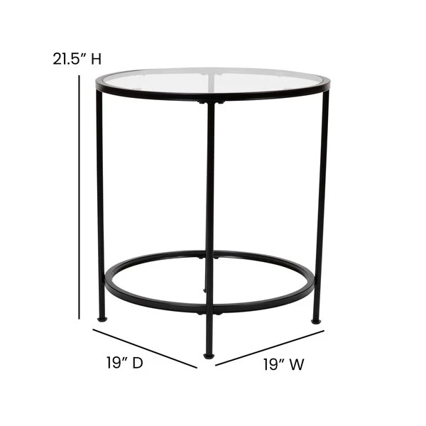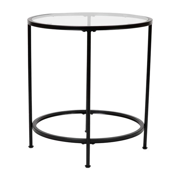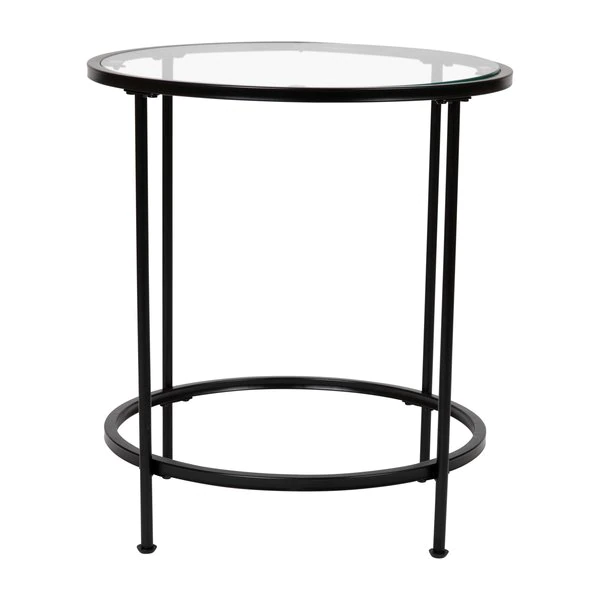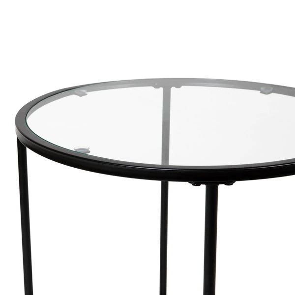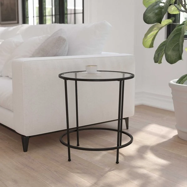 Lend any space in your home a sophisticated, polished look with this round clear glass end table with matte black steel legs. This living room end table successfully marries the beauty of glass with the strength of steel that makes a definite statement. The round top and frame contrast with the vertical legs to provide a contemporary look that's sure to tie any trendy room's presentation together. Whether you have a spacious modern home or a one bedroom apartment this round end table will fit right in. The round design is perfect for an L-shaped sectional in the living room, two wingback chairs in the den or with the sofa in the family room. Not only does its ample surface area serve as a convenient space for holding belongings, it's also great for displaying magazines, newspapers, and keepsakes. Glass offers a distinct, upscale look while providing superior strength that won't break even after heavy-duty use. Move this on-trend end table anywhere you wish without having to worry about scratches on your floors. Fixed floor glides prevent damage to your flooring and enable easy movement. Quickly remove dust or spills with a water based cleaner to keep this striking piece looking brand new. Add a pair of our glass end tables with matte black frame to pull your design together.
