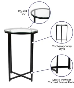 Add an upscale look to any room in your living space with the effortless style of this end table. Featuring a crystal clear glass top, this occasional table set lends an open, airy feel to any space. The round shape atop modern crisscross matte black metal legs completes the overall look of this stunning piece. Whether you're serving end, tea, or just want a place for decorative items, you will never have to worry about the safety of this table. Strong, 6mm tempered glass resists breakage even with daily use while the sturdy cross brace metal frame keeps your possessions secure. A durable powder coated finish ensures this living room table will look great for years to come. Have your new table ready to use in under 30 minutes with the included step-by-step instructions and included tools. Floor glides will protect your hard flooring surfaces from scuffs and scrape and messes clean up quickly and easily with a water based cleaner.