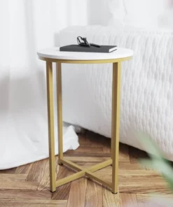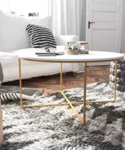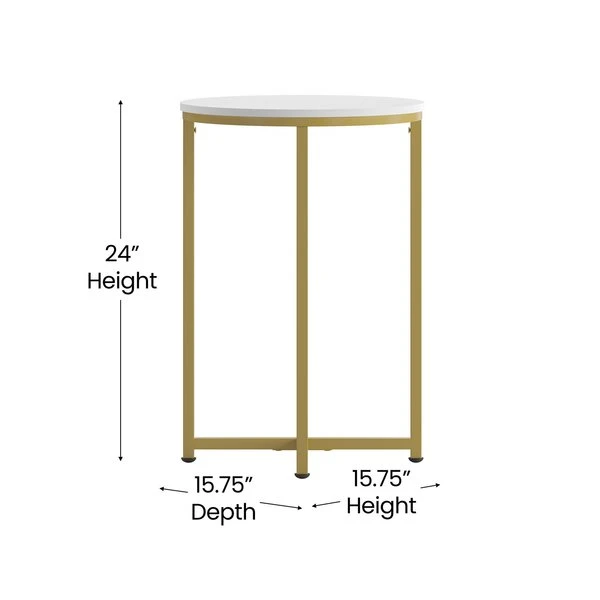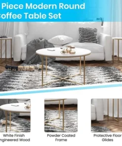 Update the atmosphere in your home with the sophisticated, polished look of this 3 piece mixed media coffee table set. Featuring white engineered wood tops, this occasional table set blends seamlessly in any space. The round shape atop modern crisscross brushed gold metal legs completes the overall look of these stunning pieces. Whether you're serving coffee, tea, or just want a place for decorative items, you will never have to worry about the safety of these tables. The strong .5 inch thick engineered wood top stands up to daily use while the sturdy cross brace metal frames keep your possessions secure. A durable powder coated finish ensures this living room table set will look great for years to come. Have your new tables ready to use in under 30 minutes with the included step-by-step instructions and included tools. Floor glides will protect your hard flooring surfaces from scuffs and scrape and messes clean up quickly and easily with a water based cleaner.